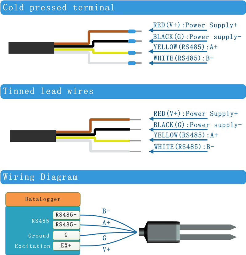 Product Series: MT05R Sensor Series; Measuring Parameters: Substrate Moisture & EC & Temperature; Power Supply: 3.0-28V DC Output Interface: RS485(Modbus-RTU); Connector: Cold pressed terminal; Cable Length: 2 Meters |